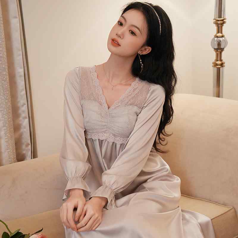 ・カテゴリ: ワンピース・スタイル: フレンチ・主な素材: ポリエステル 98%・生地: アイスシルク・ネックライン: Vネック・袖丈: 長袖・スカート丈: ロング・機能: 通気性、快適・用途: ルームウェア・対象: 女性・カラー: 灰紫色・サイズ展開: S、M、L、XL・特徴: 胸パッド付き