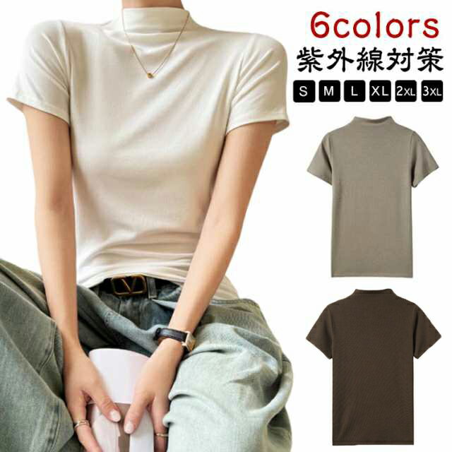 半袖 ボトルネック シンプル ハイネック ハイネック 日焼け対策 紫外線対策 きれいめ 重ね着 レイヤード トップス ストレッチ Tシャツ 紫外線カット インナー 日焼け防止 春夏 首 カットソー サマー 白 黒 レディース
