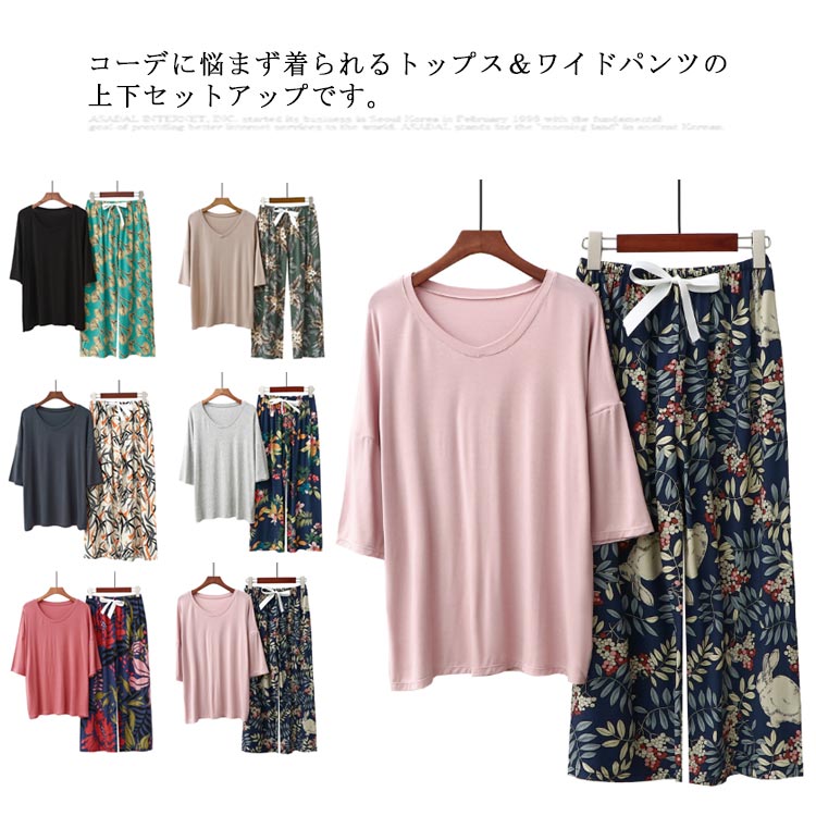 ルームウエア レディース パジャマ ナイトウエア 寝間着 部屋着 2点セット 上下セット セットアップ 上下2色 ゆったり 送料無料 トップス 七分袖 ズボン ワイドパンツ リラックス モダール 自宅ワーク 在宅勤務 カットソー 無地 花柄 婦人 可愛い ギフト プレゼント