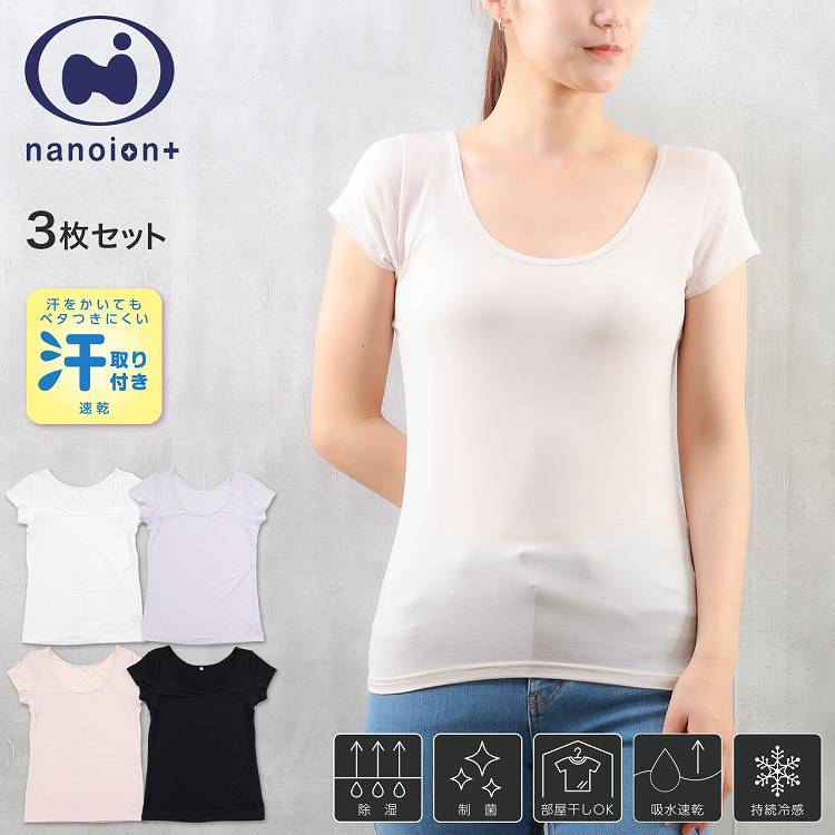 インナー レディース フレンチ袖 半袖 脇 汗取り付き 無地 nanoion+ 3枚セット 汗取りパッド 半袖インナー 汗ジミ対策(半袖シャツ トップス 脇汗対策 吸水速乾 下着 肌着 女性下着 婦人肌着 レディースインナー 女性用下着 脇汗取り