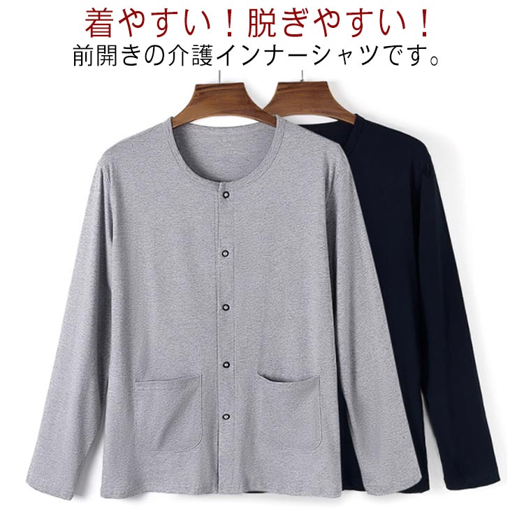 長袖 インナーシャツ メンズ パジャマ 前開きシャツ 前開きTシャツ 男性 トップス 綿 下着 介護下着 大きいサイズ ルームウェア 介護シャツ 夏用 夏 高齢者 紳士 肌着 アンダーウェア 高齢者 病院用 入院 施設 介護 肌着 コットン 骨折