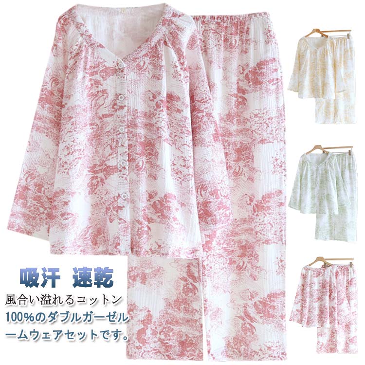 長袖 パジャマ 上下セット 前開き 綿100% ダブルガーゼ 長袖トップス ロングパンツ 花柄 レディース 春 夏 ルームウェア セットアップ 入院 薄手 ゆったり 体型カバー 吸汗 速乾 ナイトウェア 寝間着 長ズボン 長袖シャツ 二重ガーゼ 母の日 プレゼント ギフト 【送無】