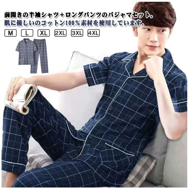 100%綿 半袖 パジャマ 前開き 上下セット 半袖シャツ ロングパンツ メンズ 春 夏 ルームウェア セットアップ 入院 旅行 半袖トップス 長ズボン ポケット付き ナイトウェア 寝間着 ゆったり 薄手 吸汗 速乾 学生 男子 高校生 【送無】