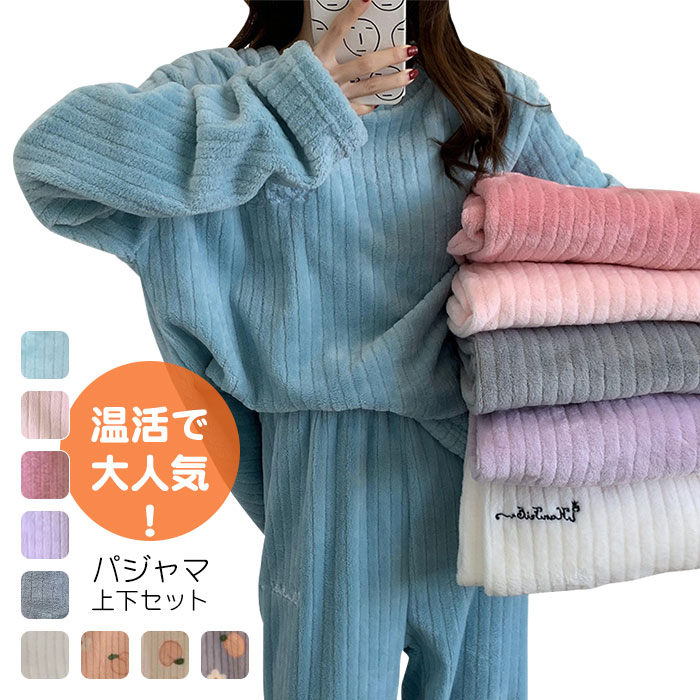 ルームウェア レディース かわいい 長袖パジャマ 冬 プルオーバー もこもこ 起毛 暖かい セットアップ トップス パンツ 2点セット 大きいサイズ 部屋着 寝間着 ラウンドネック ウエストゴム