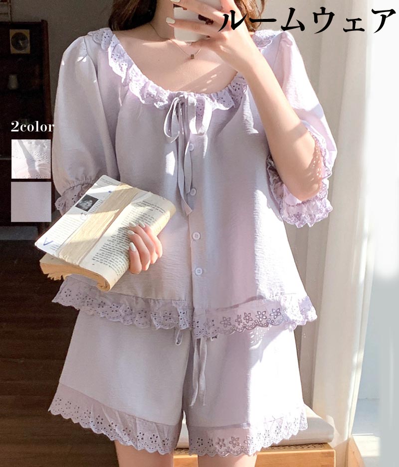 送料無料 ルームウェア 春夏 レディース 可愛い レース付き パジャマ 上下セット 半袖 トップス 短パン ショートパンツ 2点セット 部屋着 寝巻き 薄手 ゆったり ウエストゴム 前開き ボタン 開襟 オープンカラー プレゼント 楽天海外通販