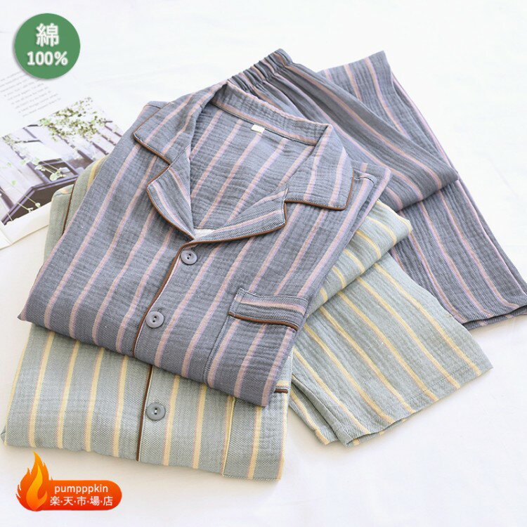 綿100% 男性パジャマ 快適な 長袖 ゆったり ダブルガーゼ クレープ パジャマ メンズ 春 夏 秋 薄手 ストライプ柄 男性パジャマセット 大人用 オープンカラー 前開き ナイトウェア 部屋着 寝巻き 寝間着 父の日 ギフト プレゼント トップス+パンツ グレー グリーン M L XL