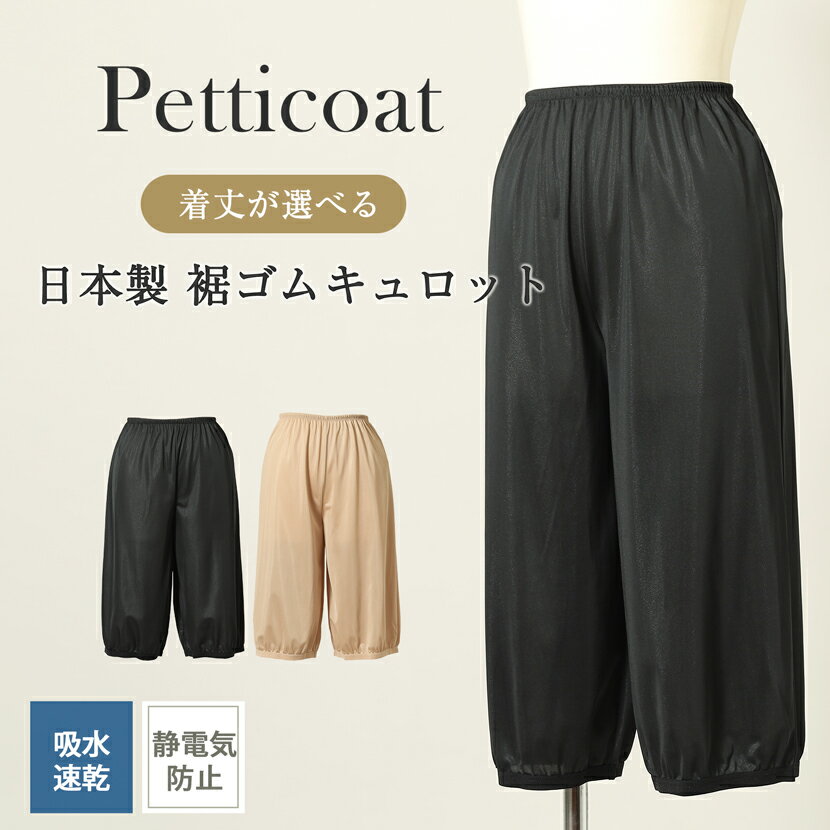ペチコート 裾ゴムキュロット 日本製 肌着 インナー レディース ミセス 女性 吸水速乾 静電気防止 選べる着丈 黒 ブラック モカべージュ オールシーズン 春 夏 秋 冬 M L LLトリコット素材 shi-70007