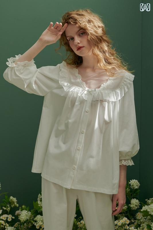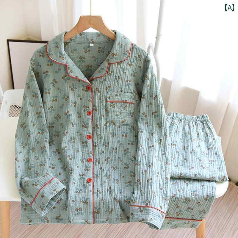 ルームウェア レディース パジャマ 女性用 夏の パジャマ 牧歌的な 薄手 スタイル 白い 襟 綿 ガーゼ 長袖 春秋 ウェアラブル ホーム 服 セット