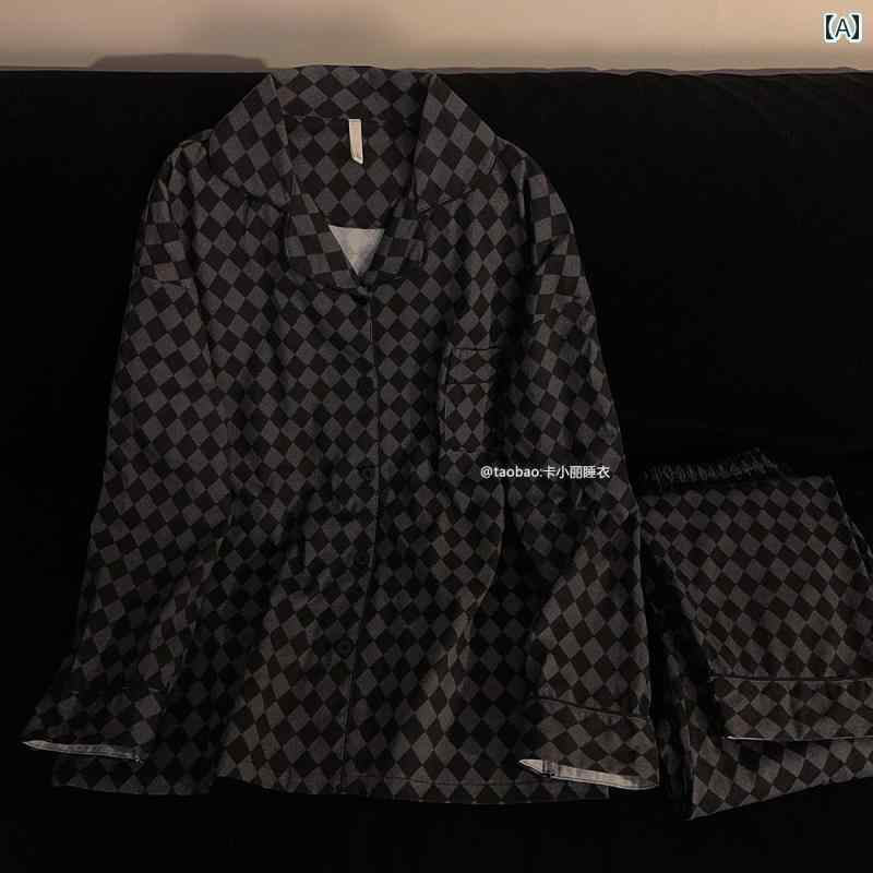 パジャマ 上下 薄手 黒と グレーの チェック 柄の 綿 パジャマ 男女兼用 長袖 春秋 スタイル小 襟 イン カップル ホーム 服 スーツ 薄手