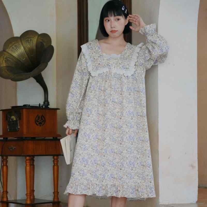 ネグリジェ 女性用 フレンチ フラワー柄 かわいい レトロ ワンピース パジャマ 綿 長袖 ロング丈 ゆったり プリンセス風 ルームウェア 透気性 快適 在宅 外出可能 秋冬 春
