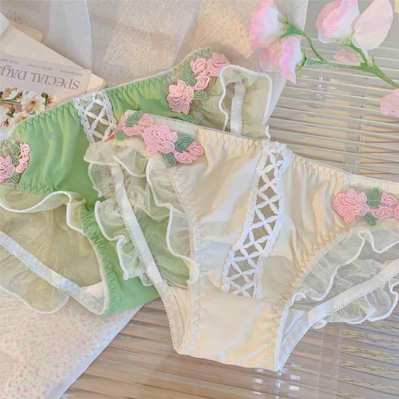 ショーツ レディース ランジェリー 下着 パンティー ローウエスト 花 刺繍 クロスカット レース 透け感 通気性 薄手 フリル フェミニン セクシー かわいい アプリコット 緑 黒