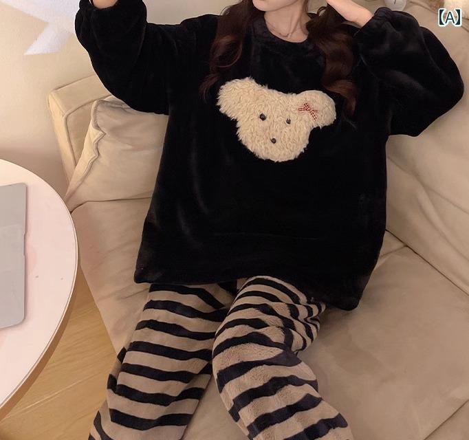 ルームウェア レディース パジャマ 部屋着 ガーリー もこもこ 秋冬 長袖 ラウンドネック ボーダー ブラック グリーン ホワイト
