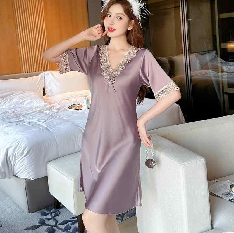 パジャマ レディース 春夏 半袖 レース 接触冷感 シルク 膝丈ワンピース 薄手 涼しい Vネック ルームウェア 寝巻き 部屋着 M L XL 2XL 3XL ローズ紫 黒 グレー 孔雀グリーン 杏色 桜ピンク
