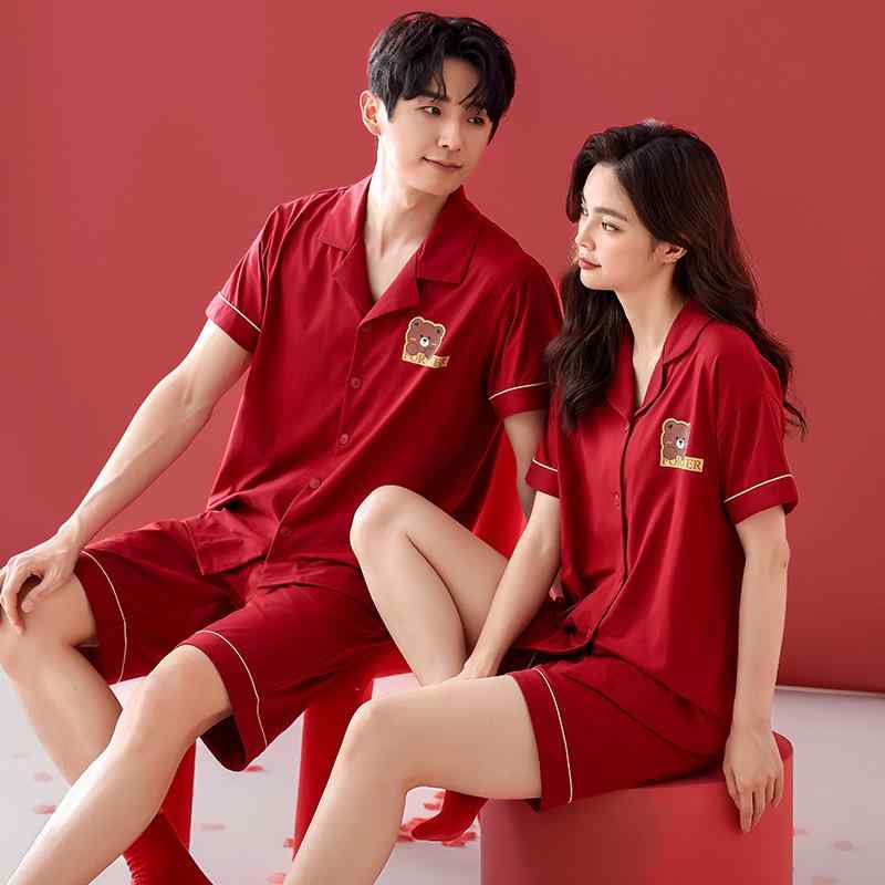 パジャマ レディース 女性用 花嫁 結婚 セットアップ 上下セット 開襟シャツ 半袖 ショートパンツ 綿100% 再生繊維 高級感 レッド 赤 薄手 涼しい 春夏 ルームウェア 部屋着 通気性 伸縮性