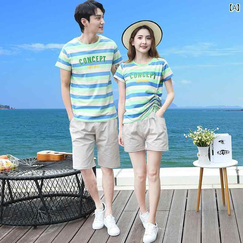 カップル ユニセックス ウェア カップルの 服装 2025 夏の 三 亜 旅行 休暇の 写真 撮影は ストライプの メンズ レディースの 半袖 カジュアル スーツを 着用 します
