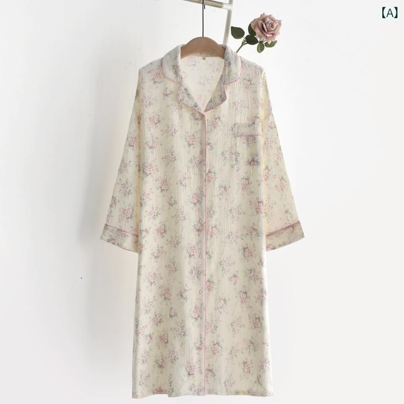 ナイトガウン パジャマ 甘い プリントの ナイトドレス、 レディース、 春と 夏、 純 綿 ガーゼ、 薄手、 ゆったり、 長袖、 ホームウェア、 パジャマ、 ローブ、 バスローブ