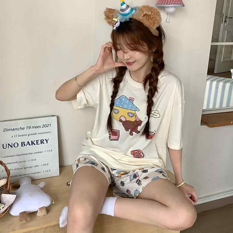 パジャマ レディース 半袖 短パン セットアップ 薄手 綿 夏 春 ホームウェア かわいい カートゥーン クリーム 小犬 寝間着 部屋着 リラックス 通気性 伸縮性 快適