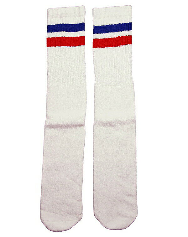 SkaterSocks ロングソックス 靴下 男女兼用 ソックス スケート スケボー チューブソックス Knee high White tube socks with Royal Blue-Red stripes style 2 (22インチ)