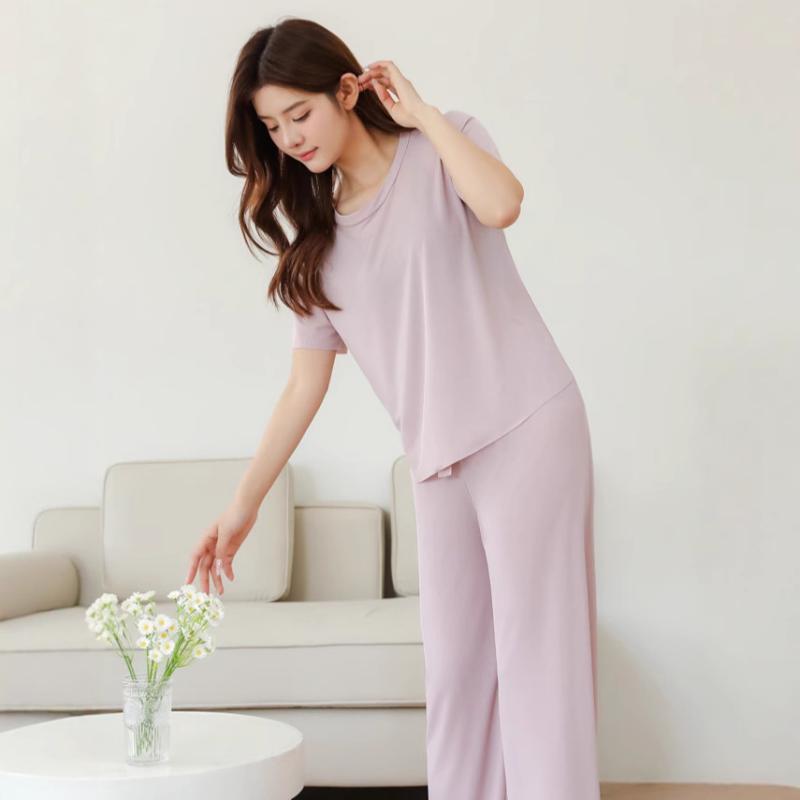 ルームウェア レディース メンズ 夏 接触冷感 薄手 上下セット 2点セット ロングパンツ ショートパンツ ゆったり リラックスフィット 部屋着 普段着 ワンマイルウェア パジャマ クルーネック 半袖 通気性 伸縮性 ポリエステル パステルカラー