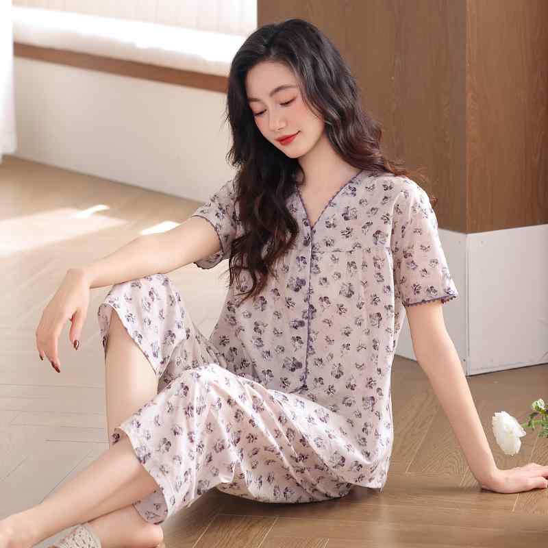 パジャマ レディース 中年 ママ向け 大きいサイズ 半袖 七分丈パンツ シルクコットン 夏 薄手 ラウンドネック 通気性 伸縮性 快適 上下セット