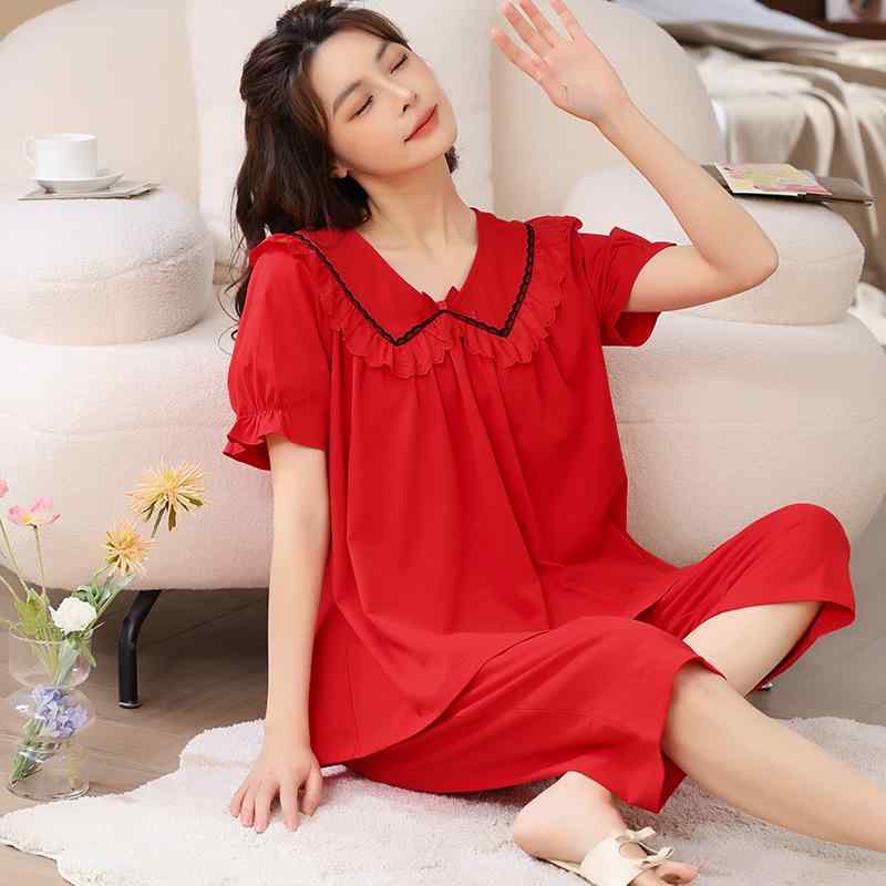 ・カテゴリ: パジャマ・主な素材: 綿・スタイル: プルオーバー・生地の厚さ: 適度な厚み(141-160g/m²)・ネックライン: クルーネック・袖丈: 半袖・パンツ丈: 七分丈・機能: カジュアル、通気性、睡眠、入浴、伸縮性、部屋着、快適性・季節: 夏・対象: ミセス向け女性・利用シーン: アウトドア、部屋着・カラー展開: レッド、ロータスグリーン、キャンディピンク、キャンディグリーン、コーラルピンク、フルーツグリーン、ポメロレッド、スノーピンク、シアーグリーン、パウダーパープル、イブニングミストピンク、フレグラントレッド・サイズ展開: M、L、XL、XXL、XXXL・主な素材成分: 綿30%以上50%未満・テイスト: フェアリーテイスト