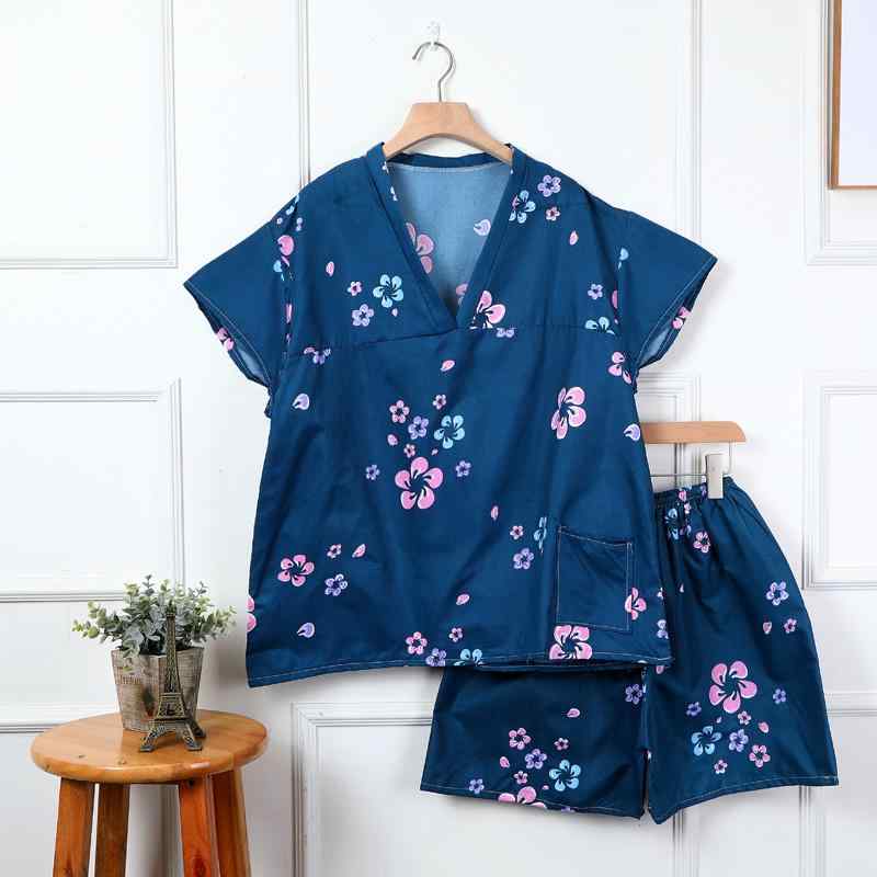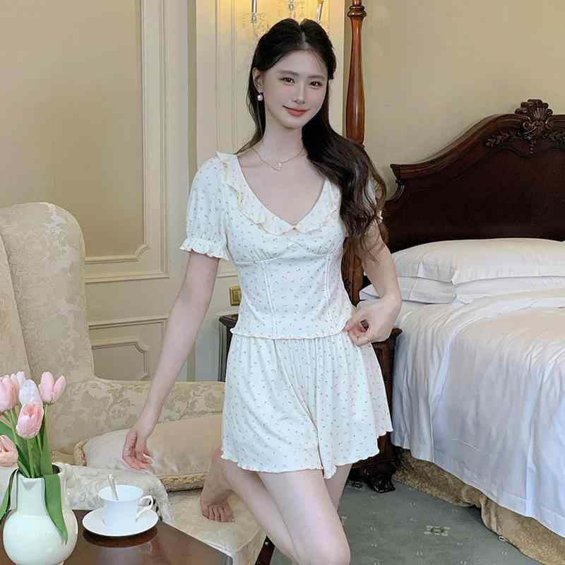 ・カテゴリ: セット・主な素材: ポリエステル90~95%・厚さ: 薄手・袖丈: 七分袖・丈: ショートパンツ・特徴: カジュアル、通気性、快適、胸パッド付き・対象: 若年女性・着用シーン: 部屋着・柄: 花柄・サイズ展開: S, M, L, XL・スタイル: フレンチ