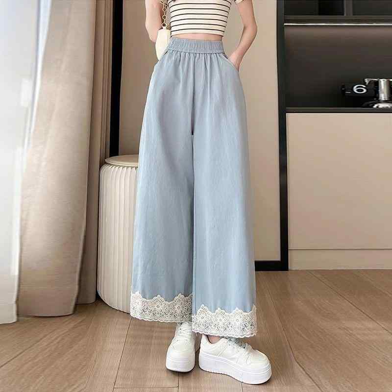 パンツ レディース レース 切り替え ワイドレッグパンツ ハイウエスト ゆったり スリム ストレート 9分丈 カジュアル 薄手 ブラック ピンク系 ブルー系 ベージュ ポリエステル スパンデックス