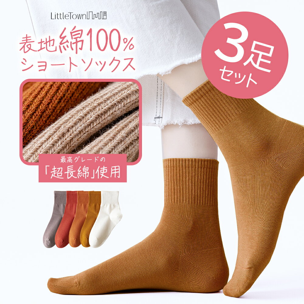 綿100% 表糸 ショートソックス 3足セット 綿 コットン 靴下 ソックス ショート丈 差し色 22cm-24cm レディース くつした くつ下 クルー カラフル カラー 春 夏 秋 冬 お洒落 厚手 綿 超長綿 リブ 耐久性 伸縮 大人 カラフル アースカラー