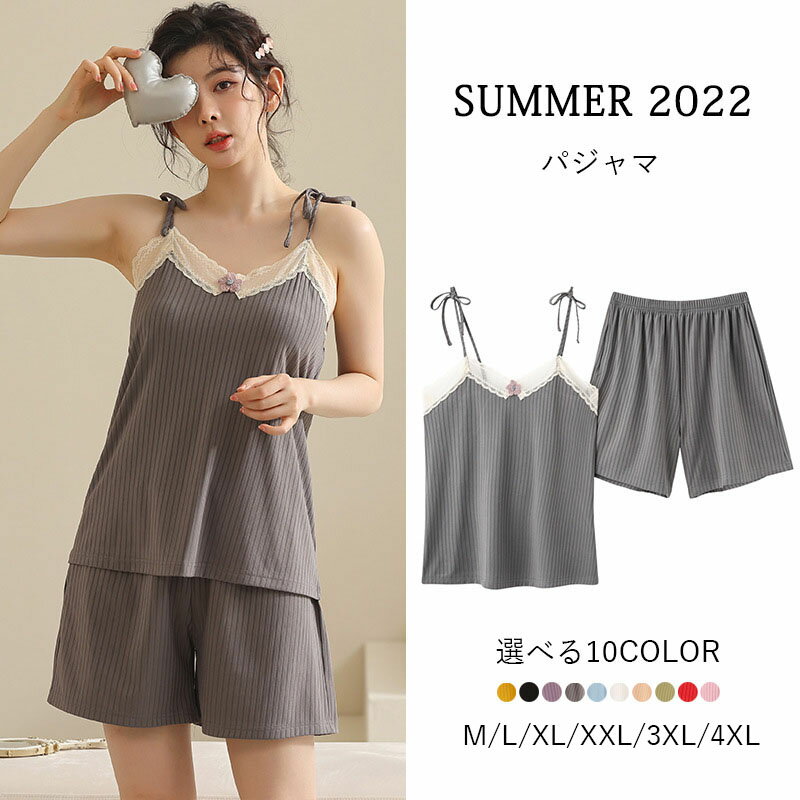 【送料無料】セットアップ パジャマ リブレースキャミソール&ショートパンツセット パジャマ楽盛りキャミソール 上下セット レディース