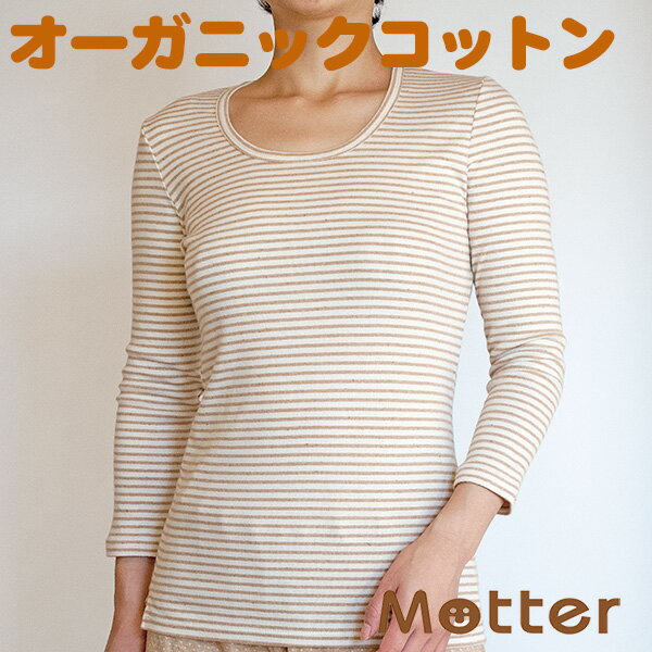 サイズ・Mサイズ ・Lサイズ カラー・ボーダー・きなり・ブラウン染色加工無漂白、無染色素材綿100%【オーガニックコットン100%】 認証機関のオーガニックコットン 認証済みのフェアトレード原綿使用製造国日本製配送方法真空パック包装にて配送オーガニックコットン肌着【フライス起毛八分袖Tシャツ】(ボーダー) 純オーガニックコットン100%のフライス起毛生地を使用したレディース用八分袖Tシャツ。 最近は化学繊維の温かなインナーが人気ですが、このフライス起毛生地は100%天然素材の安心素材なのに、とっても温かいのが特徴。 化学繊維では感じることのできない、純オーガニックコットンのふかふかな肌触りはとても心地よく、化学繊維が苦手な方や、肌が敏感な方にはオススメです♪ 商品の特徴について 天然素材のふわふわオーガニックコットン八分袖Tシャツ 天然素材ならでのふかふかの柔らかさと、温もりは、とてもやさしく心地よい感触。 コットン(綿)は吸水性や保湿性などに優れているので、下着には最適の素材と言われておりますが、オーガニックコットンはさらに肌触りも抜群の気持ちよさ♪ピュアな綿の感触が、どれだけ心地良いことか…是非一度体験してみては如何でしょうか? 純オーガニックコットン100%生地 生地はもちろんオーガニックコットン100%。オーガニックでない一般の綿や、他の繊維は一切混ぜておりません。 綿花の栽培時はもちろん、製品加工時にも化学薬品を使用しないミュッターのオーガニックコットンは、天然素材本来の柔らかさや温もりを、強く感じることができる商品です。 乾燥肌や敏感肌、アレルギー肌にもやさしい素材 天然素材100%のオーガニックコットン八分袖Tシャツは、アトピー性皮膚炎などのアレルギー肌や、カブレや乾燥肌など、お肌が敏感な方にとってもやさしい商品です。一般的な綿製品は、綿花の栽培から製品加工まで大量の化学薬品が使用されていますが、当店のオーガニックコットンはそれらを一切使用していないので、肌への刺激が少なく肌ストレスを感じない商品です。 日本一厳しいオーガニックコットン製品基準をクリア! 当店の製品は世界的な認証機関で認証された純オーガニックコットンを100%使用していることはもちろん、日本で最も厳しいオーガニックコットン製品基準の日本オーガニックコットン流通機構の「NOCコットン」認証取得製品です。しかもご注文をいただいてから、国内の自社工場で縫製し、輸送中に化学物質が付着しないよう真空パック包装でお届けしています。
