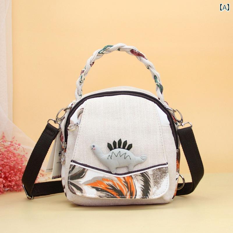 バッグ レディース かわいい 恐竜 立体装飾 布製 ミニ スクエアバッグ ハンドヘルド 斜めがけ ショルダーバッグ リュックサック 普段使い デイリー 麻混紡 編み込み ファスナー開閉 オープンポケット