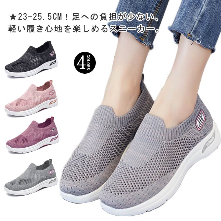 ★23-25.5cm!足への負担が少ない、軽い履き心地を楽しめるスニーカー。【通気性】通気性もとても良く清潔感のある爽やかな履き心地で、長時間歩いても蒸れにくいです。【滑り止め、弾力性】底面は優れた屈曲性素材で、クッション性があり、とても歩きやすくて疲れにくいです。【超軽量】超軽量で、履いている感覚がないほどの軽量とフィット感を実現します。【脱ぎ履きもラクチン】脱ぎ履きもラクチンでとても便利で、長時間履いても疲れにくいから、遊びや仕事に大活躍してくれます。 【適用シーン】室内履きはもちろん、お散歩や運転、ナースなどの長時間の立ち仕事、通勤、トラベル携帯などにもおすすめです。 サイズ23cm 23.5cm 24cm 24.5cm 25cm 25.5cmサイズについての説明36(23cm) 37(23.5cm) 38(24cm) 39(24.5cm) 40(25cm) 41(25.5cm)素材ポリエステル ゴム色ブラック グレー パープル ピンク備考 ●サイズ詳細等の測り方はスタッフ間で統一、徹底はしておりますが、実寸は商品によって若干の誤差(1cm〜3cm )がある場合がございますので、予めご了承ください。 ●商品の色は、撮影時の光や、お客様のモニターの色具合などにより、実際の商品と異なる場合がございます。あらかじめ、ご了承ください。●製品によっては、生地の特性上、洗濯時に縮む場合がございますので洗濯時はご注意下さいませ。▼色味の強い製品によっては他の衣類などに色移りする場合もございますので、速やかに(脱水、乾燥等)するようにお願いいたします。 ▼生地によっては摩擦や汗、雨などで濡れた時は、他の製品に移染する恐れがございますので、着用の際はご注意下さい。▼生地の特性上、やや匂いが強く感じられるものもございます。数日のご使用や陰干しなどで気になる匂いはほとんど感じられなくなります。