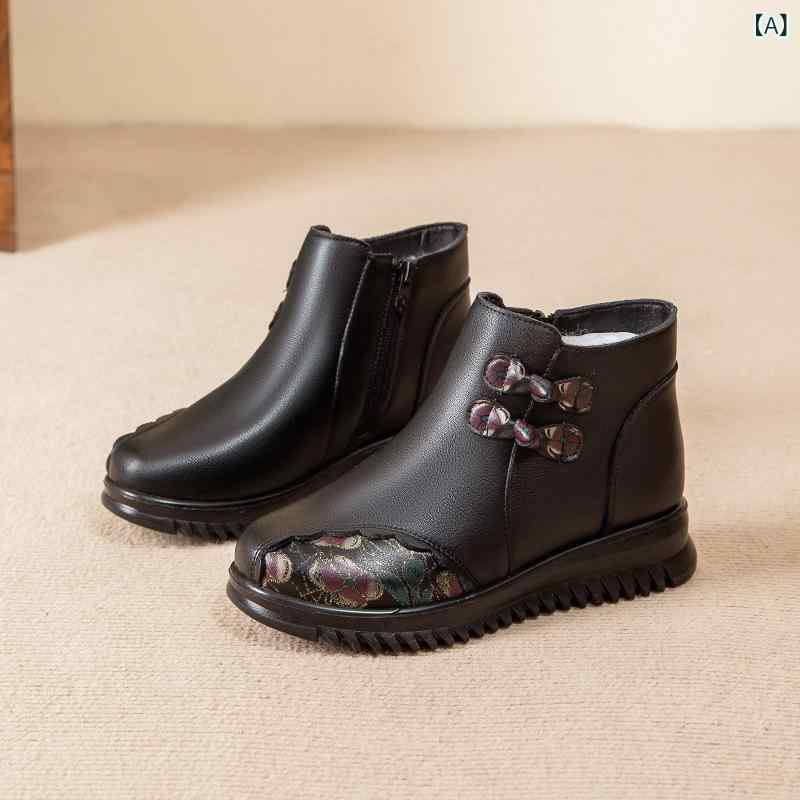 ブーツ レディース 中高年 冬 本革 ウール ライニング 保温 滑り止め 耐摩耗 ラウンドトゥ ミッドカット サイドジッパー ウェッジヒール 花柄 蝶結び 黒 カジュアル 日常 ハイキング
