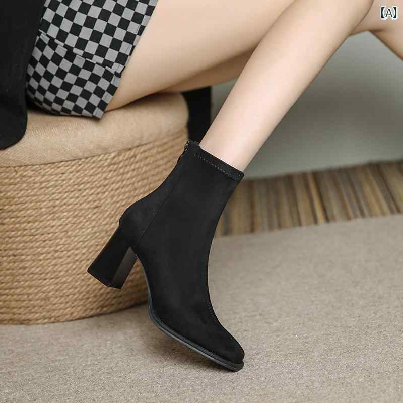 ショートブーツレディース スエードチャン キー ヒール ハイヒール ショート ブーツ レディース 2024 秋 冬 チェルシー ミッド ヒール 5 cm ラウンドトゥ スキ ニーブーツ プラス ベルベット