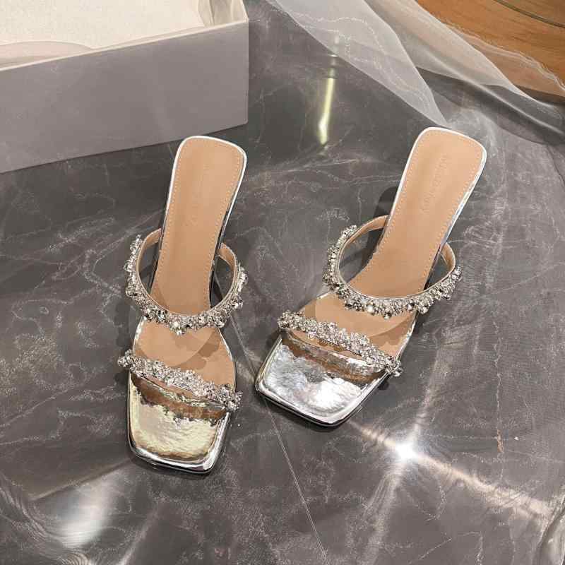 サンダル レディース フレンチスタイル ラインストーン ピンヒール スクエアトゥ クロスストラップ オープントゥ ミュール 外履き エレガント ホワイト