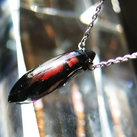NECKLACE, PENDANTブラックとレッド、ダイクロの美しいペンダント!!『Energy of soul』魂の躍動を表現した力強いペンダント。内部のレッドとダイクロ偏光ガラスの輝きを内部に垣間見ることができます。滑らかアイスロック加工を施しています。チェーンは銀古美色の縄目チェーンを使用しています。01230身に着けたイメージ。1滑らかなアイスロック加工。2レッドとブラックの力強さ。3身に着けたイメージ。ガラスアクセサリー / コレクション:ネックレス・ペンダント / 140128-155910 / 1406 / アメリカンガラス / 約37×11×9mm / 赤系黒系 ダイクロ偏光ガラス加工マーブル加工アイスロック加工 / 縄目チェーン 銀古美色 45cm / La forme アメリカンガラス,黒系,赤系,ダイクロ偏光ガラス加工,柄加工,柄(マーブル),アイスロック加工,ネックレス・ペンダント,暗い,鮮やか,ガラス製,ギフト,かっこいい,情熱的,男性的魂の躍動を表現した力強いペンダント。内部のレッドとダイクロ偏光ガラスの輝きを内部に垣間見ることができます。滑らかアイスロック加工を施しています。チェーンは銀古美色の縄目チェーンを使用しています。