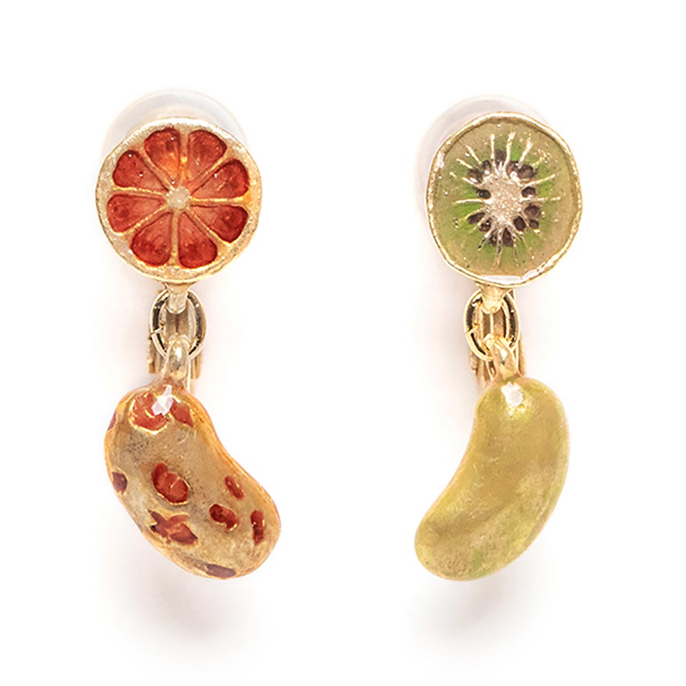 ジェリービーンズ イヤリング:Palnart Poc(パルナートポック)ジューシーなフルーツから滴り落ちてきたように揺れているのは、左右で味が違うブラッドオレンジとキウイの美味しそうなジェリービーンズ。思わずひとつぶ口に放り込みたくなるイヤリングです。つるりとしてつやのある丸いフォルムや味を表す色や模様が丁寧に表現されています。左右でデザインの違うアシンメトリーなデザインがコディネートをポップに彩ります。サイズモチーフ:全長2.5cm仕様・素材ピューター生産国日本その他ブランド紹介まるで絵画から飛び出して来たかのような、色彩豊かで温かみのあるレディースアクセサリーブランド、Palnart Poc(パルナートポック)。「やさしいデザイン」をコンセプトにどこか懐かしく、ユニークで大人の女性も楽しめる愛らしい作品を作っています。繊細な造形と豊な世界観にはたくさんのこだわりが詰まっています。1.メイドインジャパンまるでアートのような繊細なアクセサリーだからこそ日本製(Made in JAPAN)にこだわっています。2.手作業へのこだわり繊細なモチーフのため立体的なモデリングはデザイナーにしかできない技。シンプルなものから複雑なものまで、すべてがハンドメイドで作られています。3.特別な発色塗料デザインを活かすための鮮やかな発色はすべてハンドペイント。独自の手法を使って着色しています。4.動物たちへのこだわり猫(ネコ)、犬(イヌ)、クマなどの哺乳類、カエル、ヤモリなどの両生類、ヘビやトカゲなどの爬虫類、昆虫など様々な動物たちの躍動感あふれる一瞬を切り取るように造形しています。5.花へのこだわりフラワー(花)、植物など明るく伸び伸びとした印象にこだわり、身に着ける人の気分まで明るくなるように造形しています。6.自然へのこだわりスター(星)、月、空、雲、海など世界を彩る大自然を、独自の世界観で美しく壮大な印象を大切に造形しています。7.自由な発想のデザイン野菜、果物など日々の生活で身近なものや架空のものまで、毎日を楽しく彩り気がつくとクスッとしてしまうような物語を感じさせてくれる作品を自由な発想でデザインしています。8.アクセサリーごとのこだわりリング、ピアス、イヤリングは小さなモチーフに豊かな世界観をそっと閉じ込めるような感覚で、ネックレスやブローチはその世界観を自由に大きく広げるような感覚で作っています。Palnart Poc(パルナートポック)のアクセサリーはカジュアルにもフォーマルにも使える自分使いにはもちろん、大切な人やお友達の誕生日やお祝いにプレゼントすると、もらった人の驚いた顔や笑顔を見ることができる楽しい作品たちです。ジューシーなフルーツから滴り落ちてきたように揺れているのは、左右で味が違うブラッドオレンジとキウイの美味しそうなジェリービーンズ。思わずひとつぶ口に放り込みたくなるイヤリングです。つるりとしてつやのある丸いフォルムや味を表す色や模様が丁寧に表現されています。左右でデザインの違うアシンメトリーなデザインがコディネートをポップに彩ります。