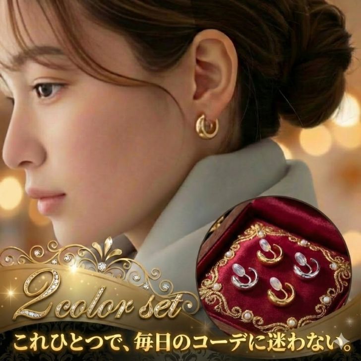 【 スーパーSALE ★ 20%OFF 】 イヤリング 痛くない ピアス見え 2色セット ゴールド シルバー フープ 金属アレルギー対応 ニッケルフリー シリコンパッド付 ノンホールピアス 落ちにくい 小ぶり 上品 ケース付 ギフト プレゼント 買いまわり 送料無料 「これ、イヤリング?」と驚かれるピアスのような輝き。ゴールド&シルバーの2色セットで、毎日のコーデがもっと楽しくなる! 【楽天スーパーSALE 限定価格!】通常価格 1,280円 ⇒ 特別価格 1,024円(20%OFF)(期間:3/3 20:00 〜 3/11 01:59)✨ 「ゴールドもシルバーも、両方欲しい!」を叶える2色セット ✨これひとつで、その日の気分や服装に合わせて自由に耳元を彩れます。数量限定・期間限定の特別なセットをお見逃しなく!✅ イヤリングの「3大悩み」をすべて解決!痛くない:シリコンパット付きで、長時間付けても耳に優しいフィット感。ピアス見え:金具が目立たない洗練されたデザインで、ワンランク上の耳元へ。アレルギー安心:金属アレルギーが出にくいニッケルフリー素材を採用しています。✅ 誰でも簡単!「4ステップ」でしっかり固定シリコンカバーを装着。隙間を耳たぶより少し狭く調整。耳たぶの薄い部分から滑り込ませる。裏から押さえこんで固定!これで「落ちにくい・失くしにくい」安心の付け心地を実現しました。🎁 大切な方への贈り物にも最適サイズ:縦1.7cm × 横1.4cm の上品な小ぶりサイズ。梱包:配送中の破損を防ぐ「専用ケース&化粧箱」に入れてお届けします。🚚 安心・充実のサービス365日当日発送:13時までのご注文で即日発送いたします。30日間全額返金保証:商品到着後、万が一の初期不具合にも誠実に対応いたします。レビュー特典:商品到着後のレビュー投稿で、次回使える5%OFFクーポンをプレゼント! 5