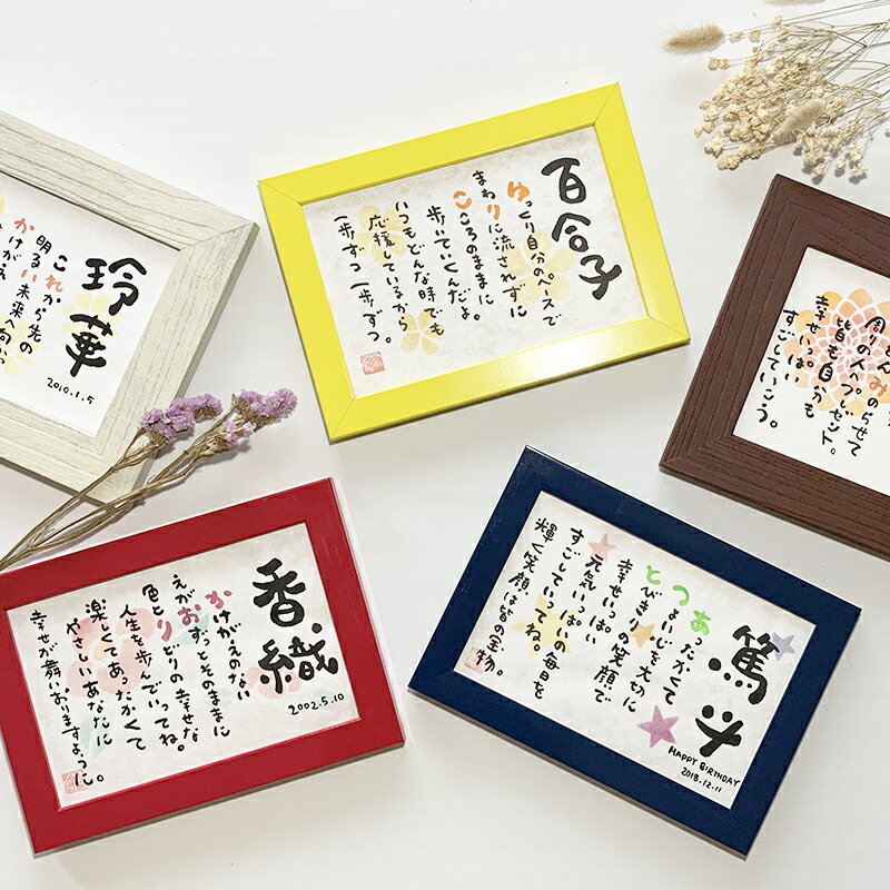 fujico 「あなたのお名前で詩を書きます」 Sサイズ 1人タイプ にこにこ踊りだしそうなかわいい文字とこころ温まるあたたかい文章でお名前を織り込んだ詩をおつくりします。センス溢れるfujicoオリジナルの背景イラストも大好評です。 右横に下のお名前が入り、文中にお名前がひらがなで織り込まれた詩をおつくりします。かわいい背景もお選びいただけます。 ・サイズ スタンダード額 外寸(約):縦192mm×横267mm×厚さ15mm ※ブラウン・ナチュラル 外寸(約):縦200mm×横275mm×厚さ13mm ヴィンテージ額 外寸(約):縦225mm×横300mm×厚さ20mm ・額の色:スタンダード額3色とヴィンテージ額6色(+1100円)からお選びいただけます。 1.額の色をお選びください。 ※ヴィンテージ額は+1100円(税込)になります。お値段はご注文確定後変更させていただきます。 ※画像7枚目(スタンダード額)・8枚目(ヴィンテージ額)参照 2.どなた用かをお選びください。※「その他」の方は備考欄にご記入ください。 3.用途をお選びください。※「その他」の方は備考欄にご記入ください。 4.背景に入れるイラストをお選びください。 ※画像9枚目参照 5.お入れする名前(漢字とひらがな)をご記入ください。 例:「美紀 みき」「武司 たけし」など 6.小さくお入れする日付等をご記入ください。 例:「2020.10.20.」「HAPPY BIRTHDAY」「祝・還暦」など ※特に入れない場合は空欄でお願いします。 7.その方のご年齢(およそ)・性別・性格・詩に込めたい想い、その他ご要望等ございましたら備考欄にご記入ください。 8.ラッピング(+220円)をご希望の方はご注文手続き最後にお選びいただけます。 ☆「発送前のお写真確認」をご希望の方はMarshaのLINE公式アカウントを友達追加後、『お名前』と『写真確認希望』とご記入の上、LINEにてお知らせください。 発送前にLINEにて完成お写真を送らせていただきます。 ※原則お作り直しは承っておりませんのでご了承くださいませ。 ※こちらの商品は基本追跡可能メール便(ポスト投函)での発送になります。 代引き、日時指定等のある場合は宅配便をお選びください。 それ以外のお支払い、日時指定のない場合は宅配便を選択いただいてもメール便での発送となります。 (額のサイズ、ご注文個数等により宅配便に変更させていただく場合があります。) ◆ご注文の際、お名前のご記入については、再度ご確認ください。お客様のご記入違いによる書き直しは、有料となります。 ◆オーダー作品になりますので、発注後、お客さま都合でのキャンセルはご遠慮ください。 ※ご注文確定後20日以内にでき次第順次お届けとなります。 ※お急ぎの場合は対応可能か確認させていただきます。いつまでにお届け希望かお届け日指定の備考欄にご記入ください。 【2〜4個ご注文】 1個ずつご入力・「かごに追加」の上、最後にご注文内容を確認後、「ご購入手続き(注文を確定)」を完了してください。 【5個以上のご注文】 1個目をご入力いただいた後、購入数を実際にご注文される個数にした上で「かごに追加」していただき、備考欄に『複数注文用紙希望』とご記入の上ご注文を完了してください。 (ご注文確認後、別途複数注文用のフォーマットをお送りします。) ※個別ラッピング(1点につき+220円)をご希望の方は備考欄に『個別ラッピング希望』とご記入ください。(ご注文確認後、代金を再計算させていただきます。)☆お名前を織り込んで世界に一つだけの詩を制作します。