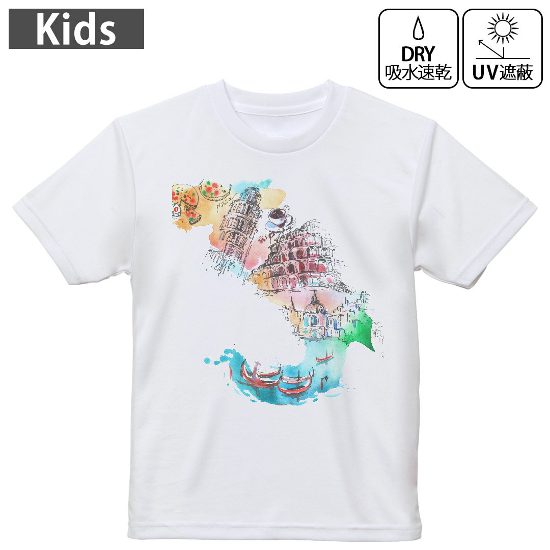 キッズ ドライTシャツ ホワイト 半袖 4.1オンス トレーニング スポーツ ジム 運動会 ドライアスレチック UVカット 紫外線遮蔽 吸水速乾 120 130 140 150 160 007403 クール 建物 イタリア イラスト カラフル