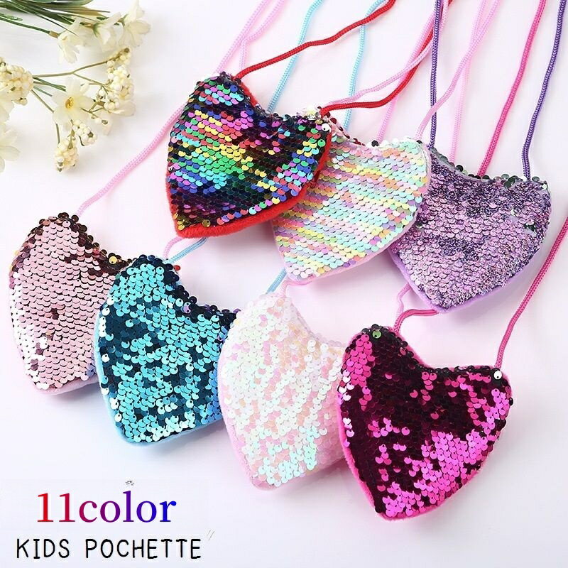 送料無料 ポシェット ショルダーバッグ ミニバッグ キッズ 子供 女の子 鞄 カバン 肩掛け 斜め掛け ハート スパンコール キラキラ 小さめ コンパクト かわいい キュート ガーリー おしゃれ シンプル ファスナー お出かけ プレゼント ギフト 白 青 紫 ピンク ローズ カラフル