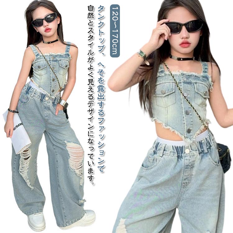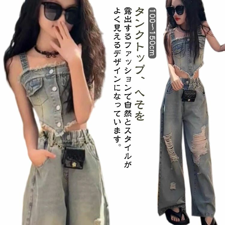 カーゴ デニムパンツ ダメージ タンクトップ キャミソール へそ出し ヒップホップ 100〜150cm ダンス衣装 キッズ セットアップ