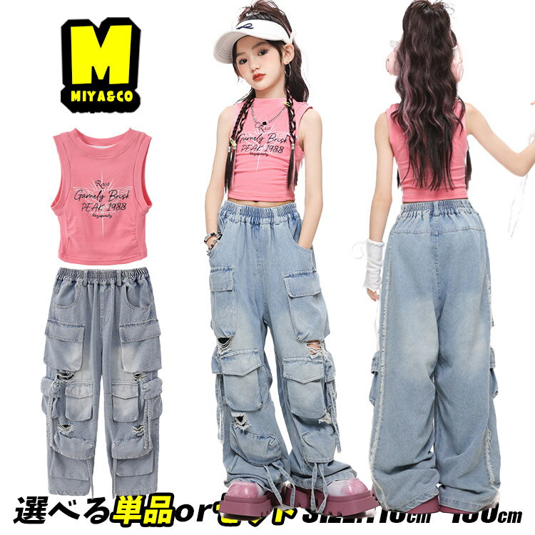 桃色 タンクトップ ショート丈 トップス へそ出し ピンク 女の子 キッズダンス衣装 セットアップ ヒップホップ チアダンス チアガール カーゴ デニムパンツ ダメージ加工 デニム ダボパン かっこいい hiphop 可愛い 団体服 応援団 演出服 発表会 韓国 k-pop