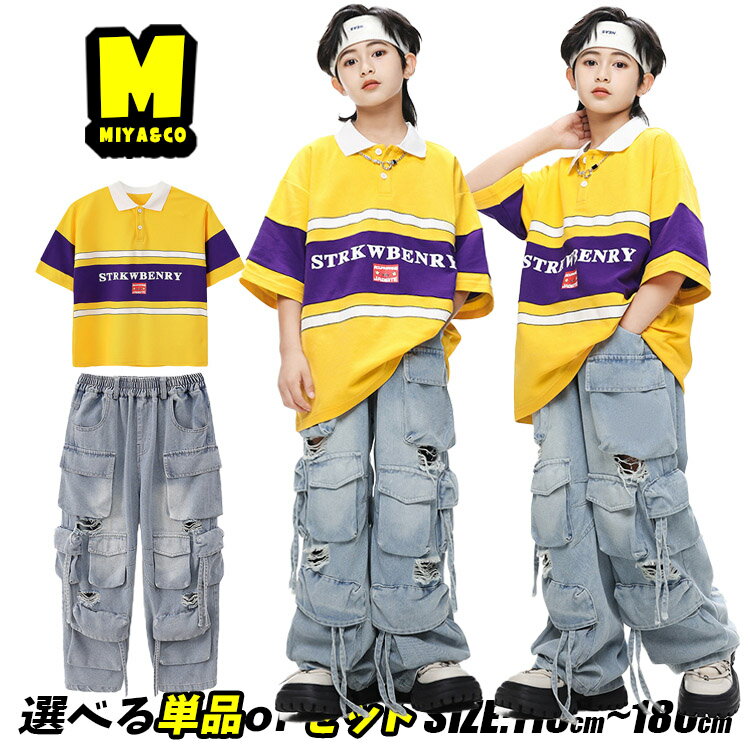 黄色系 ポロシャツ イエロー 半袖 ボーダー オーバーサイズ キッズダンス衣装 セットアップ ヒップホップ 男の子 女の子 デニム カーゴパンツ カーゴ デニムパンツ ダメージ加工 ダボパン かっこいい hiphop 韓国 k-pop 団体服 演出服 練習着 発表会 個性派 原宿系