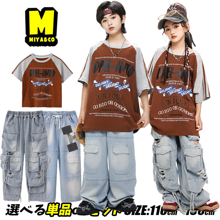 茶色系 tシャツ 半袖 総柄 英字 オーバーサイズ ブラウン キッズダンス衣装 セットアップ ヒップホップ 男の子 女の子 カーゴ デニムパンツ デニム カーゴパンツ ダメージ加工 かっこいい hiphop 団体服 応援団 演出服 発表会 韓国 k-pop
