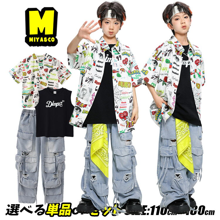 ホワイト 柄シャツ 総柄 カラフル 半袖 女の子 男の子 オーバーサイズ キッズダンス衣装 セットアップ ヒップホップ カーゴ デニムパンツ デニム カーゴパンツ ダメージ かっこいい hiphop 韓国 k-pop 団体服 演出服 練習着 発表会 個性派 原宿系