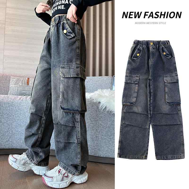 キッズ 女の子 ジュニア 秋冬 裏起毛 カーゴ デニムパンツ ジーンズ アメリカンヴィンテージ カジュアル ゆったり ストレートワイド ハイウエスト 綿混 ルーズフィット 長ズボン