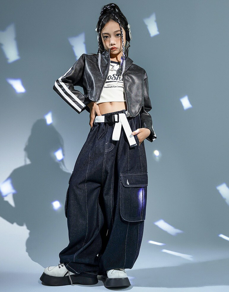 ブラックフライデー開始4H限定★全品20%OFFクーポン! キッズダンス衣装 ジャケット ショート丈 セットアップ トップス デニムパンツ カーゴパンツ ブラック 長袖 ヒップホップ hiphop kpop 韓国 子供 キッズ ダンス衣装 女の子 男の子