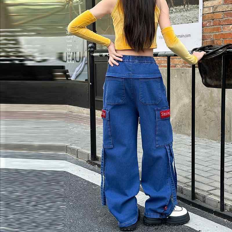 カーゴデニムパンツ キッズ 女の子 子供用 春秋 ストリート カジュアル ワイドパンツ ゆったり デニム ジーンズ ウエストゴム ロング丈 ブルー 普段使い おしゃれ 通学 通園