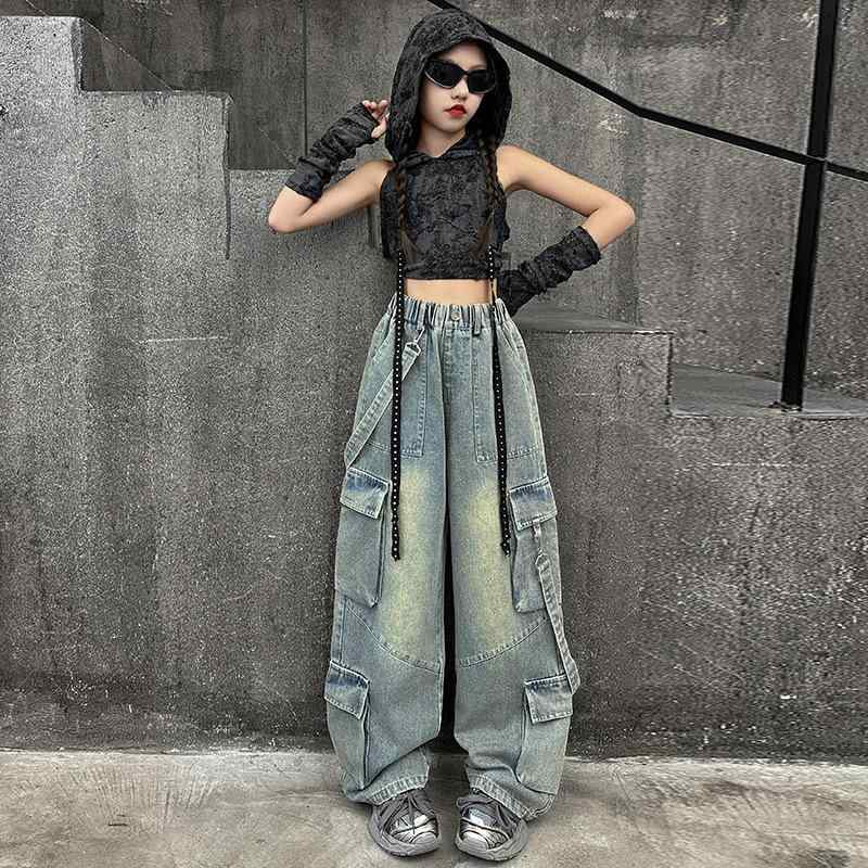 ジー カーゴ デニムパンツ ダメージ タンクトップ キャミソール へそ出し 女の子 ヒップホップ セットアップ デニム ダンス衣装